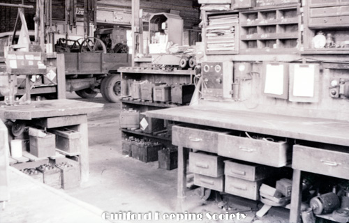 Clarence Norton garage interior, showing workbench with test equipment and shelves of batteries 78 Boston St at the northeast corner with Graves Ave. c1940 Shelton W. Dudley Sr