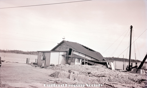 Hurricane damage, Sign saying E.S. Ball Thimble Island Oyster, on a badly damaged building Stony Creek Sept