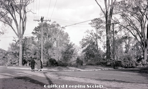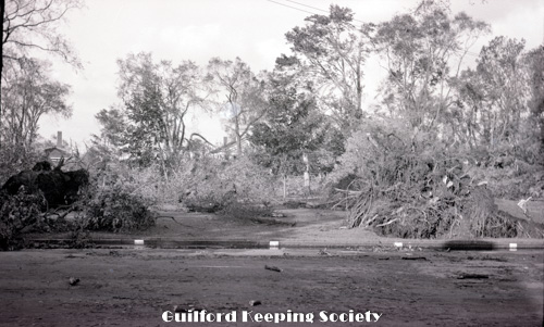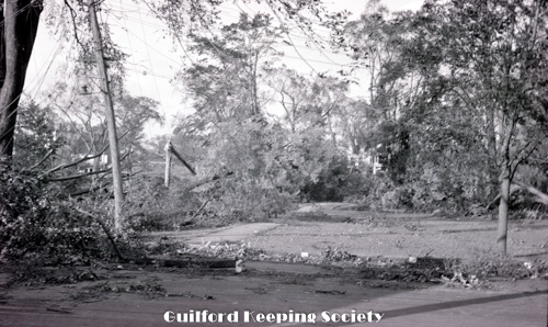 Hurricane damage, jungle of trees down on the Green. Looking north up Whitfield St First National Store is on the left Whitfield St Sept