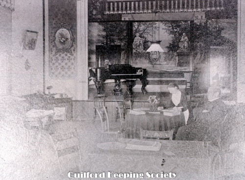East River Reading Room, Madison. Interior showing grand piano set up on stage. Man and woman seated at a round table. Copy photo Boston Post Rd, Madison 153 c1890 Shelton W. Dudley Sr