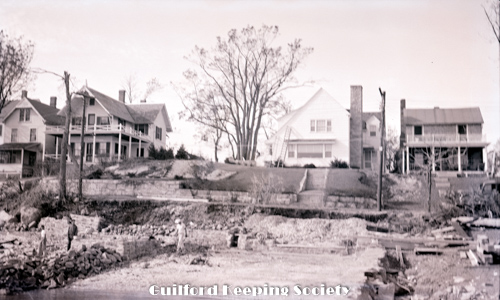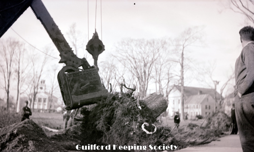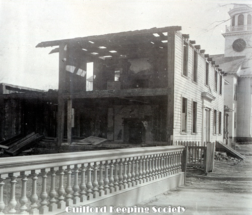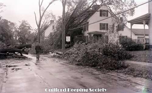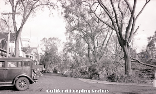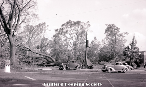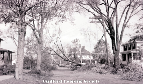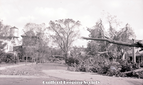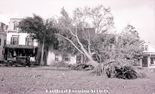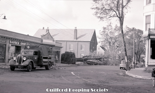 Hurricane damage at southeast corner of the Green. Barber and Guilford Movie theater on the corner of Water and Whitfield St are on the right 2-10 Water St near corner with Whitfield St Sept