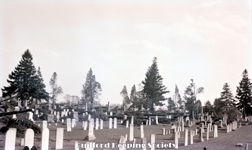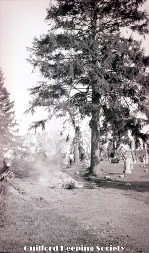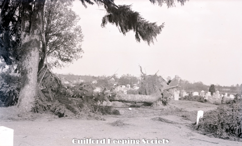 Alderbrook Cemetery with toppled evergreen trees, showing hurricane damage Boston St Sept