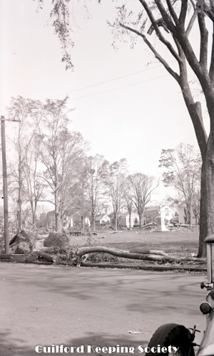 Hurricane damage, looking across the Green toward the library at 67 Park St Note the bandstand and Civil War statue Green Park St 67 Sept