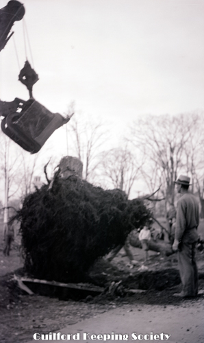 Hurricane damage, steam shovel removing a large tree stump. First Congregational Church at 110 Broad St in left background Green Sept