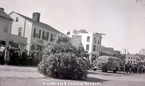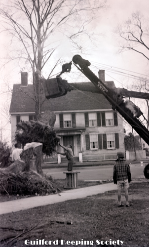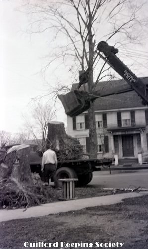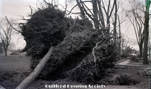 Hurricane damage, large tree down on the Green. Hale Store at 25 Whitfield St on the left in the background. Green Broad St 110 Sept