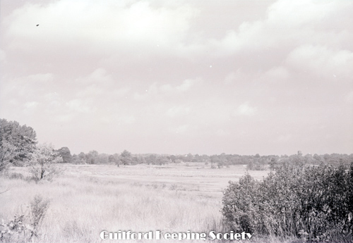East Creek meadows with salt hay gathered in rows. Water tower on Clapboard Hill is on the right in the distance. Water St 42 c1964 Shelton W. Dudley Sr