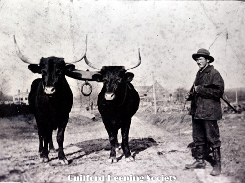 farmer with boots and switch stick and yoke of long horned oxen. Old colonial house in the background. Copy photo Long Hill Rd Long Hill Rd c1905 Shelton W. Dudley Sr