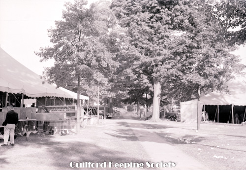 Guilford Fair on the Green, chickens and ducks in cages on the right in tents looking up the sidewalk Green 1950 Shelton W. Dudley Sr
