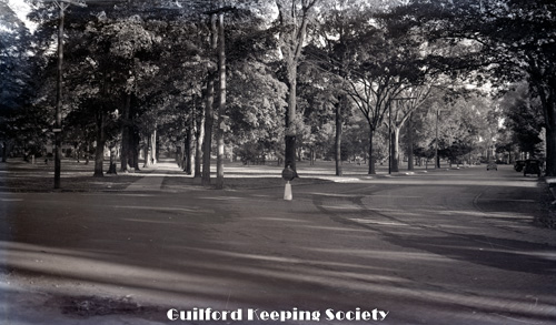 Green, northwest corner looking southeast. Note the bandstand on the Green. Directional sign to the Henry Whitfield St Broad St to the right