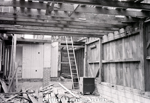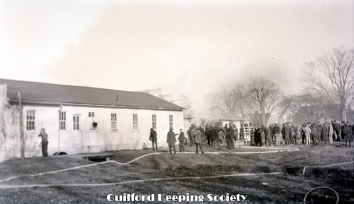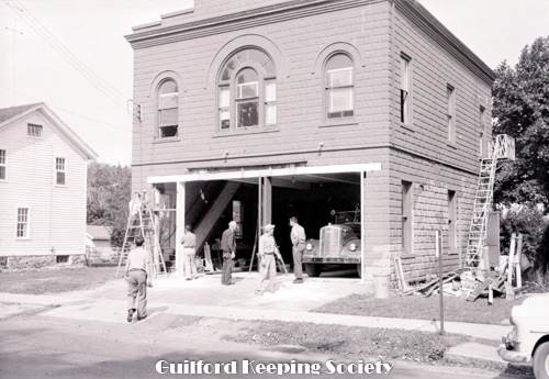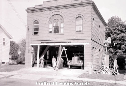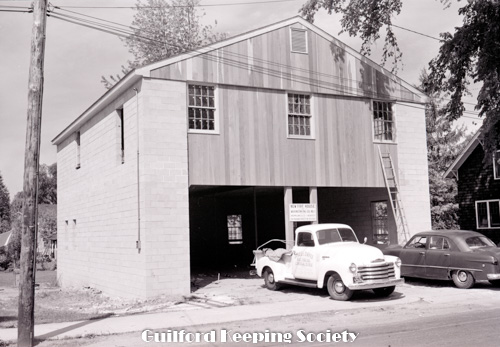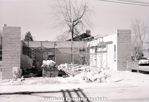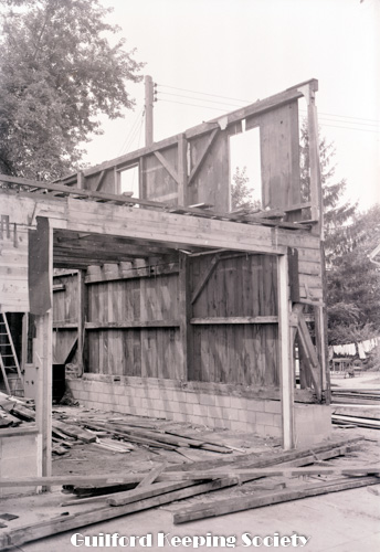 J. J. Sullivan, Inc. cinderblock building under construction for business garage, cupola on a building is in the background 229 River St c1940 Shelton W. Dudley Sr