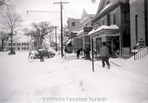 Boston St looking east. Page Hardware is on the right. Scene in the snow, men and boys shoveling snow 9 Boston St c1945