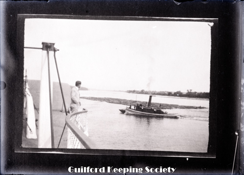 steam tug boat on a river bringing raft of logs down river. taken from a boat