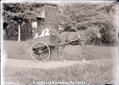 woman and 2 children in horse drawn 2 wheel cart, road in front of large mansion