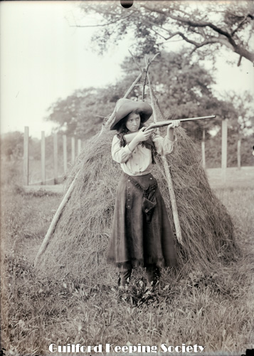 young woman in cowgirl costume aiming rifle. pile of hay in background