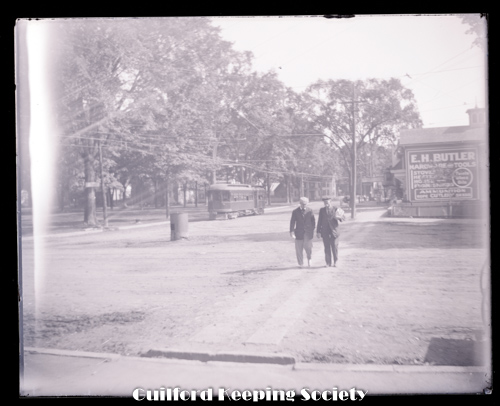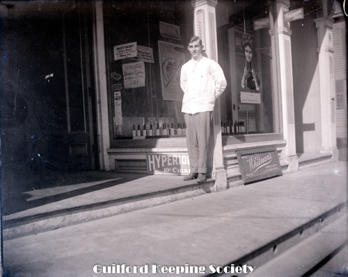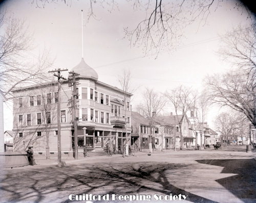 buildings at southwest corner of Green. most prominent Monroe’s pharmacy. note corner of old Elliot house on left. children with bicycles and horse drawn buggies