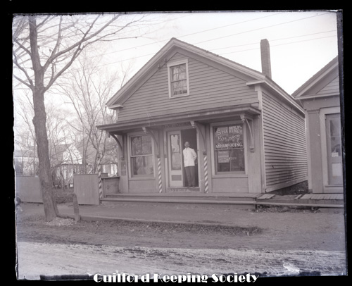Adolph G. Sommers barber shop (gone). Mr. Sommers standing in doorway