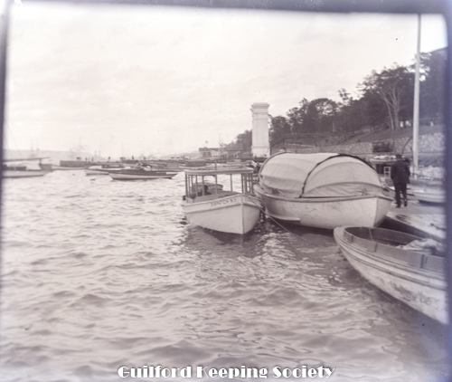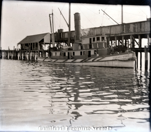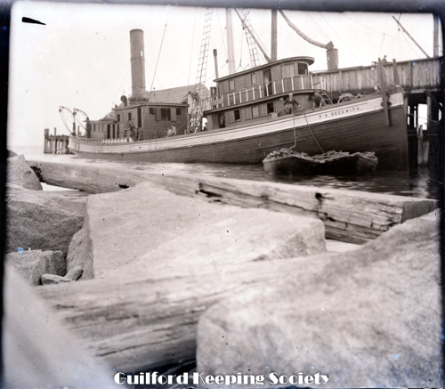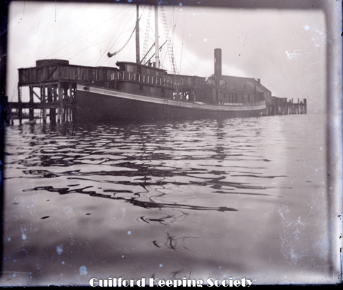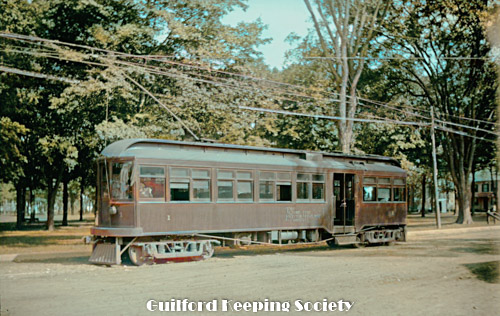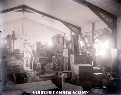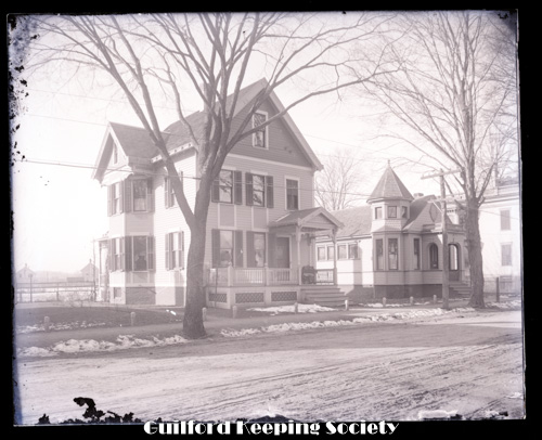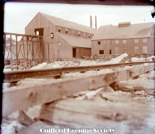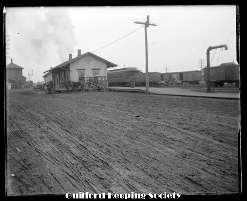 Guilford railroad station and surrounding buildings. moving train. canning factory north of tracks on Driveway