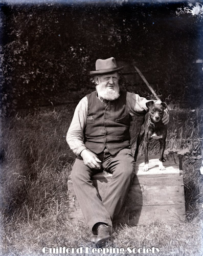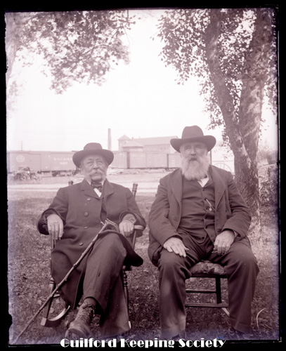 2 old men (Bishop, Bishop ??) on lawn with Guilford train station water tower in background. J. E. Norton & Son wagon in the picture