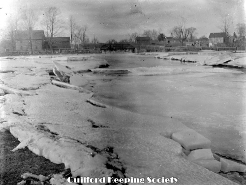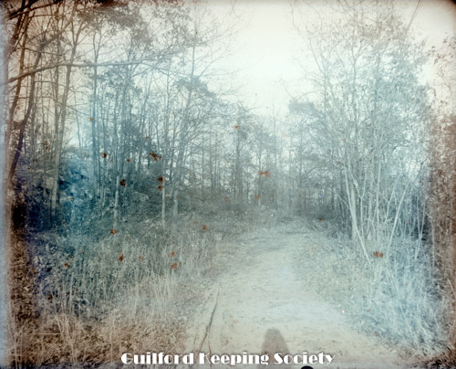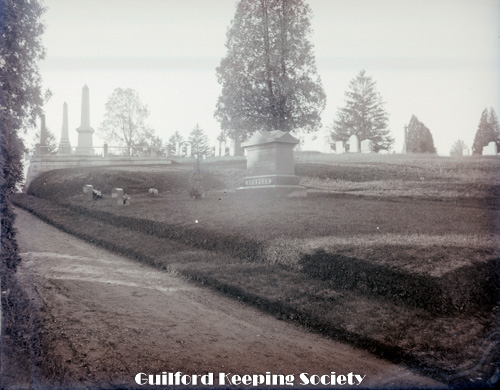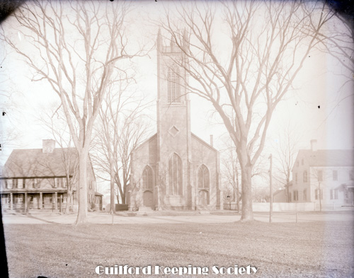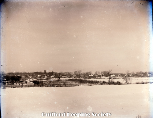 Looking north from the grounds of the Henry Whitfield house 248 Whitfield St. Steeple of Episcopal church and houses east of the Green on Boston St. are visible.