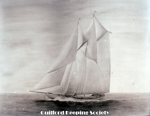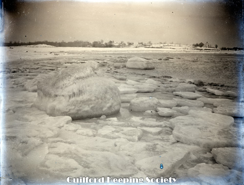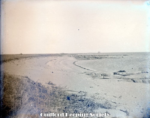 Vineyard Point shore scene, Sachem’s Head. looking southeast across Razor Beach with the barren southernmost promontory of Vineyard Point extending into the ledges. Three masted schooner on the horizon