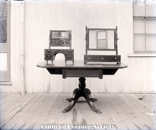 2 shaving mirrors in stands with drawers sitting on top of pedestal table with drawer. Eva B. Leete’s antiques.