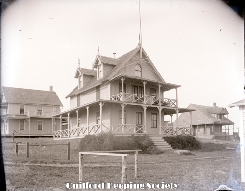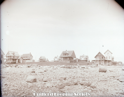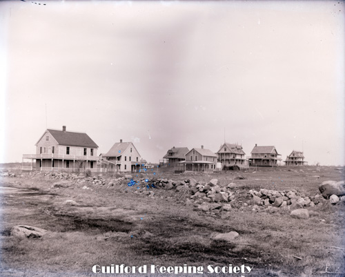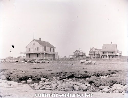 Vineyard Point cottages at summer colony, Sachem’s Head left to right Lander & Worden cottage site of 628 Vineyard Point Rd1896. Trueblood & Lane cottage 624 Vineyard Point Rd1907. Spencer cottage site of 616 Vineyard Point Rd 1894. Mrs. Worden cottage 46 Vineyard Ave.1900 Vineyard Point cottages at summer colony, Sachem’s Head