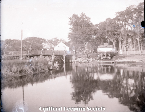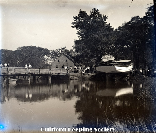 Gray Dawn launching, 60-foot twin screw schooner built by William P. Fowler for Dr. Hurst of Washington DC. William P. Fowler’s new boat sliding into the peak high tide at the edge of West River at Jones Bridge. Note old wooden Jones bridge (dismantled in 1910). Note the Bille Willard house in background at 137 Water St