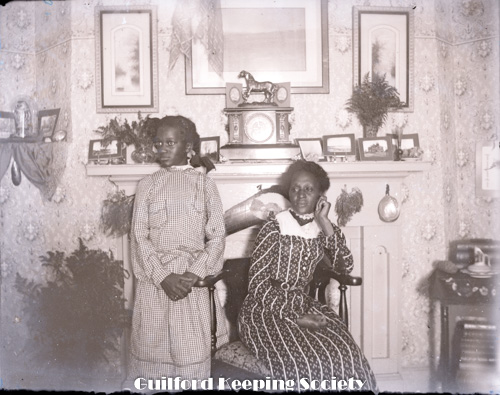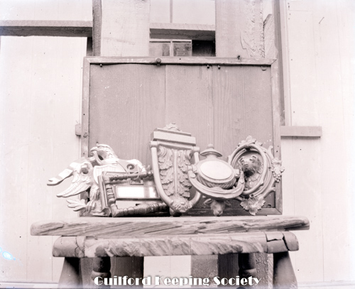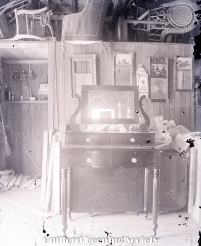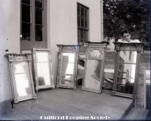 five early nineteenth century gilt mirrors, Eva B. Leete’s antiques. Probably Frank Leete supporting mirror, corner of Guilford Institute showing
