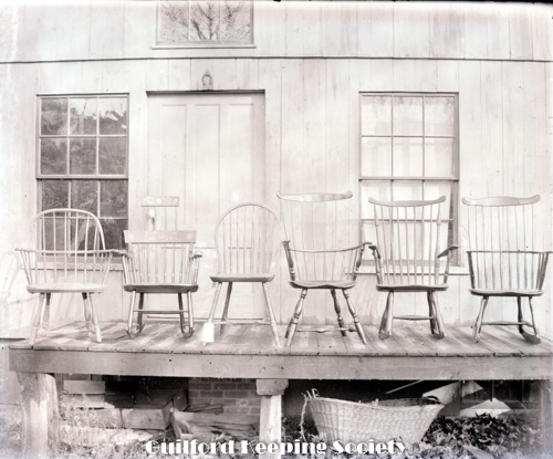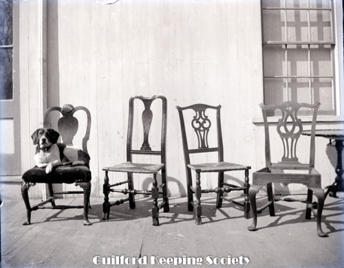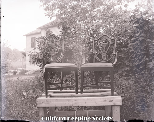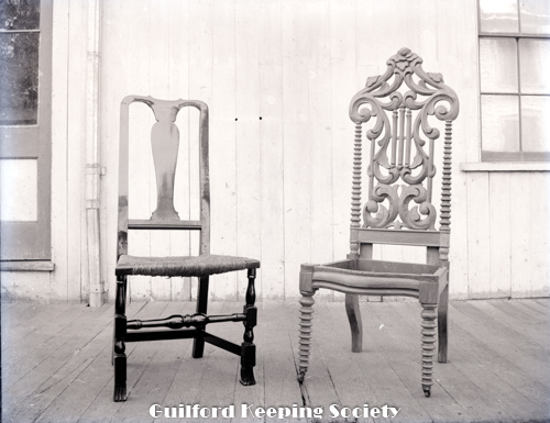 2 chairs, 1 fiddleback, rush seat, Spanish feet, 1 English or Boston chair, strange looking turnings. Eva B. Leete’s antiques, outside on a porch, Edward Leete’s workshop