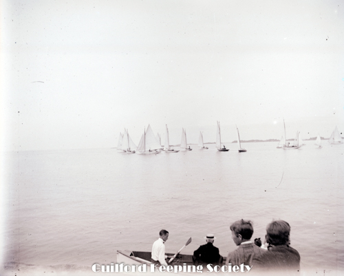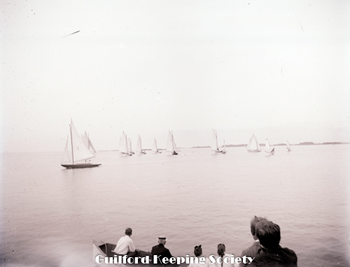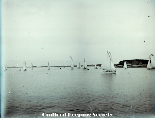 sailboats racing. leaving Sachem’s Head Harbor, tip of Uncas Point in background
