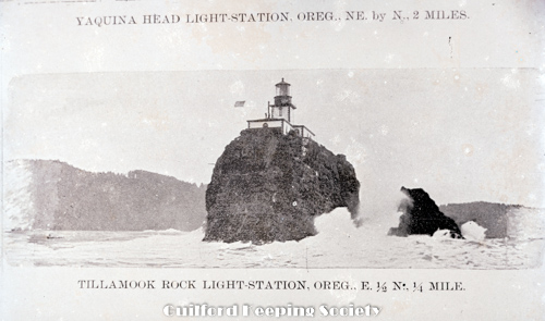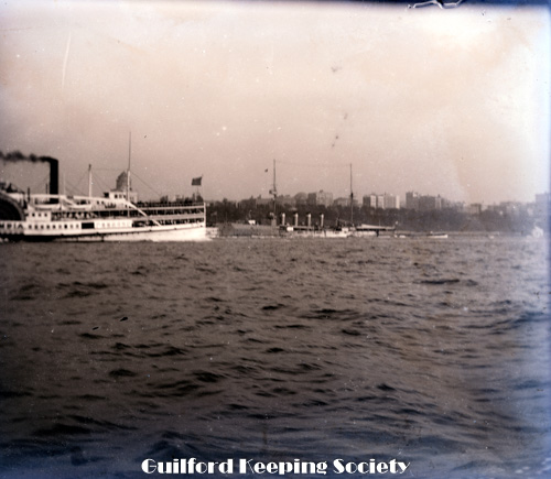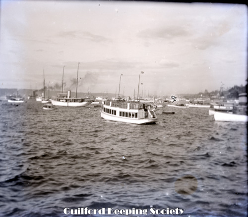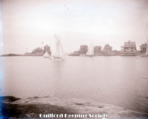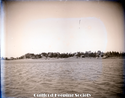 View of Sachem’s Head summer colony from water, including the Sperry Hotel in the center and Rockbound cottage on the right