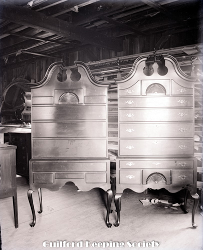 2 highboys, 1st with 3 flame finials. fans center top & bottom. 2nd similar bonnet, finials missing, hardware missing, only one fan, top center -with bonnet similarity appear to have same maker. Eva B. Leete’s antiques