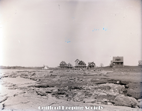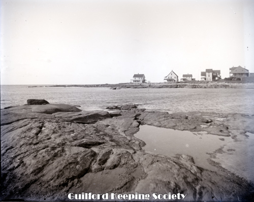 Five Vineyard Point cottages in summer colony, Sachem’s Head. Looking west from a point on ledges off Benton Beach. House on far left is Helen Wells cottage on the site of 19 Vineyard Ave.