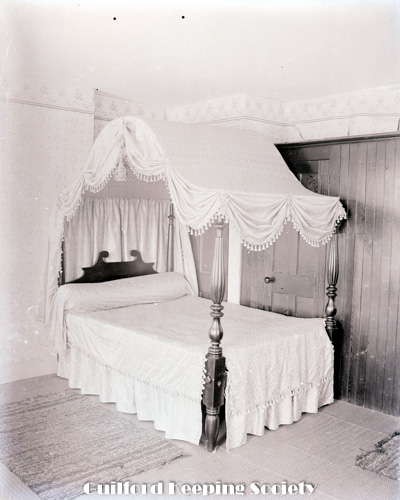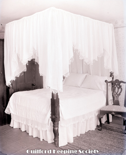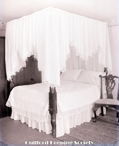 Canopy bed with 4 posts, early 19th century. bedside rag rugs on straw mats on floor. Eva B. Leete’s antiques 96 or #98 Fair St,