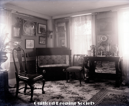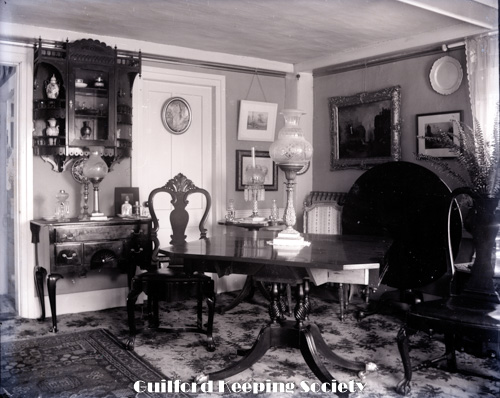 roomful of antiques. chairs, lighting devices, table. at Eva and Edward Leete’s house 96 Fair St.