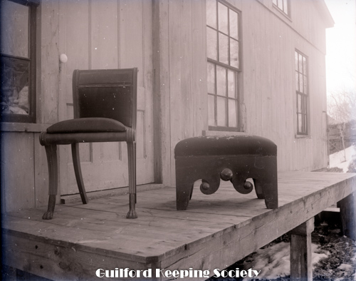 side chair, cushioned seat. empire looking, but strange hassock with cushioned top, curved base. Eva B. Leete’s antiques