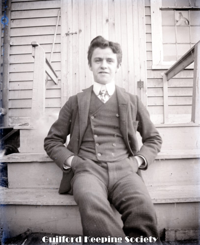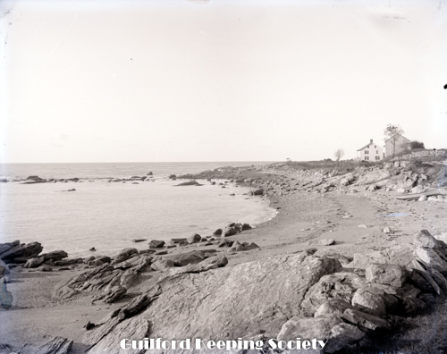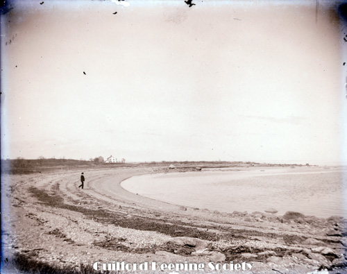 Benton or Bartlett Beach east of Vineyard Point, Sachem’s Head. Oliver Brooks Husted standing on the beach. Daniel Brown Leete house (stood on the site of 101 West Lane) in the background. Looking toward Turkey Point, which is the southernmost part of Leete farm