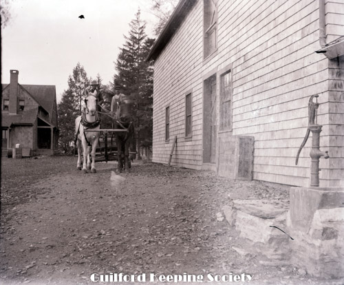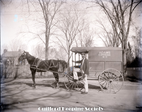 Adams Express Co. Horse drawn buggy. Whitfield house on left. Lynde Kelsey is the driver according to Shelton Dudley