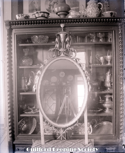 elaborate oval mirror in front of China cabinet. Husted’s camera reflected in mirror. Eva B. Leete’s antiques 96 or #98 Fair St, inside Eva B. Leete’s antiques shop