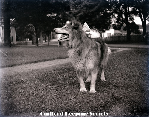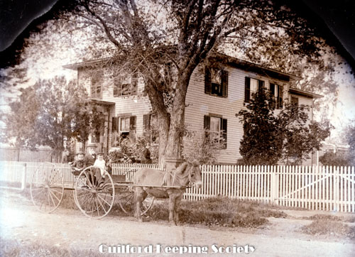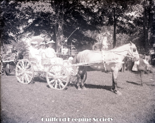 Guilford Fair Horse drawn buggy with ladies on Green trimmed for Guilford Fair. W.W. Baldwin Store (later Griswold Store) and First Congregational Church on Broad St in the background. Broad St #102