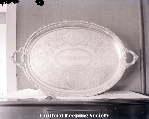 tray. probably silver. initials (?)RBM. scenes on sides. Eva B. Leete’s antiques