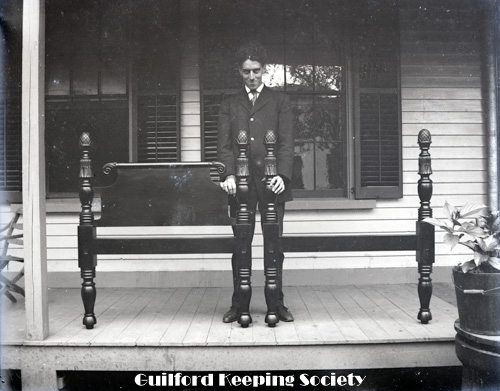 empire style bed being held by an unidentified man, possibly Frank Leete. Eva B. Leete’s antiques