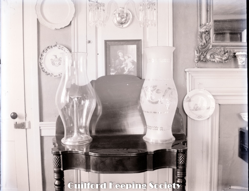 glass chimneys. one frosted and incised, one plain with folded base. c. 1800. sitting on card table. one has silver candlestick. Chinese export plate left lower wall. above - salt glazed charger, c. 1770. Eva B. Leete’s antiques. Edward and Eva Leete’s house