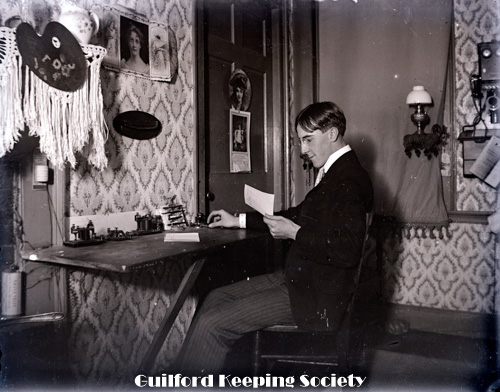 Edward G. Husted, Jr. seated probably at home in Col. William Hart house with telegraph key (1884-1937)
