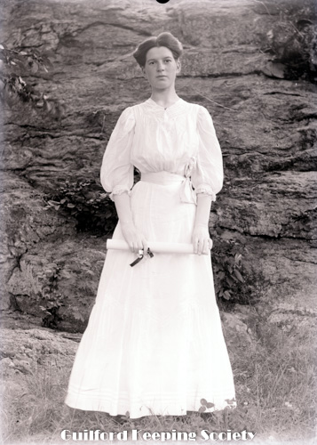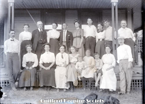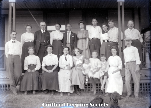 Hooker Dudley house (Ruttawoo), family reunion of about 35 people. Man standing under American flag is Andrew Jackson Dudley