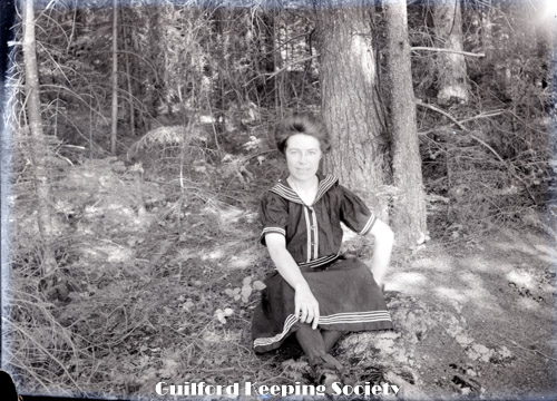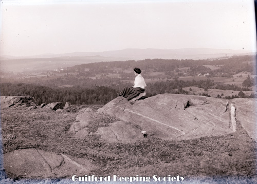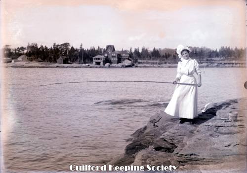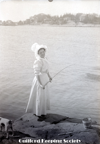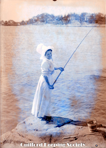 woman fishing in bonnet looking across Bloody Cove Bay, standing on the rocks of Vineyard Point, on property owned by Jack English in 1997