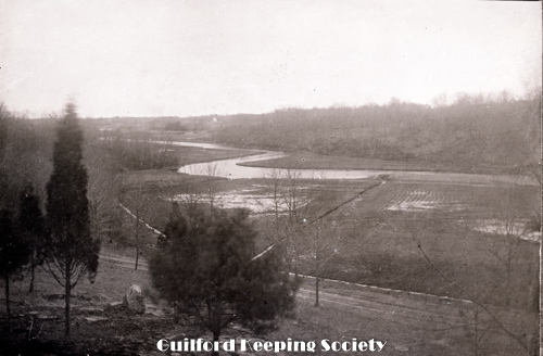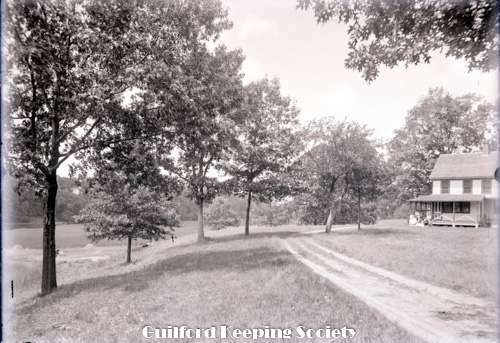Andrew Jackson Dudley house on right with view of trees and driveway. East River showing on far left.