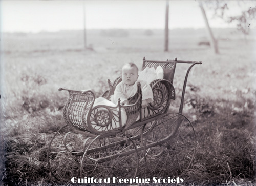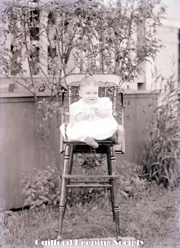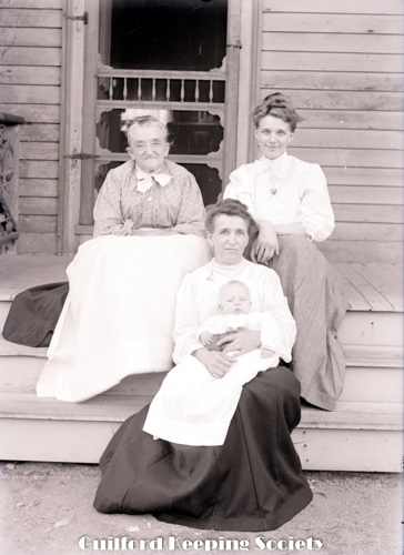 3 women and a baby. Probably a 4 generation picture. Seated on a porch.