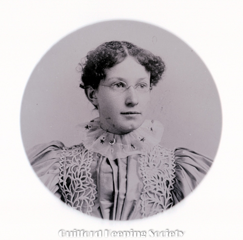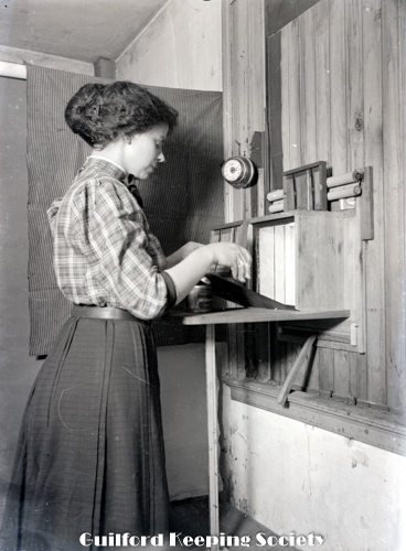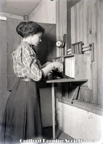 Edith Thrall in her darkroom at light box printing a plate in Col. William Hart house