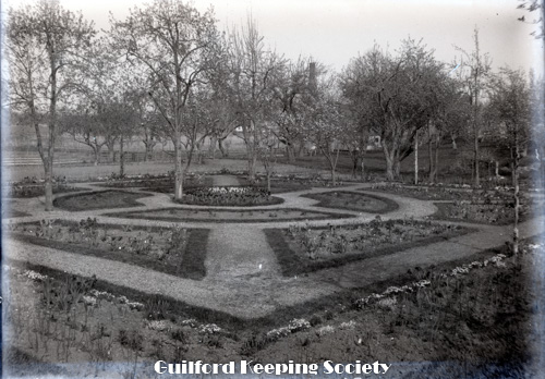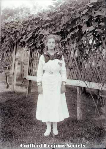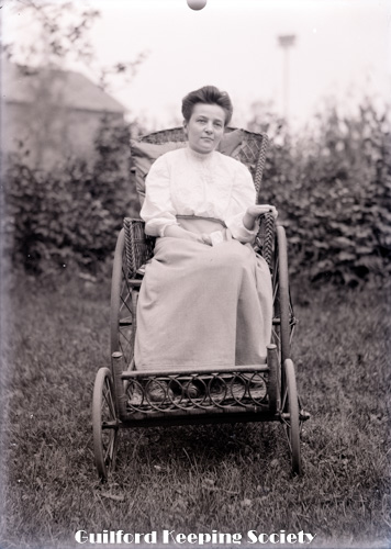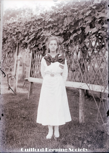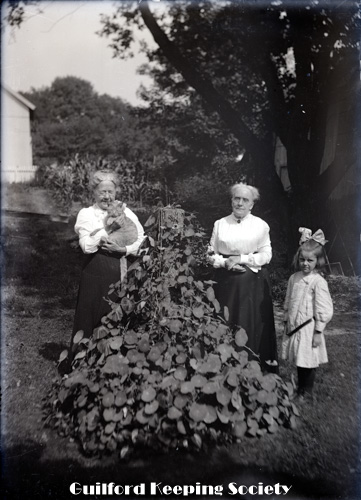 Rear of large, shingled, rambling house. Grape arbor, large apple tree and lawn swing. Probably the rear of Gov. Rollin S. Woodruff house